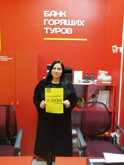 В третий раз обратилась в компанию Банк горящих туров. Нравится сервис, цены + сертификаты со скидкой на следующую покупку. В будущем жду больше офисов в г.Пермь....